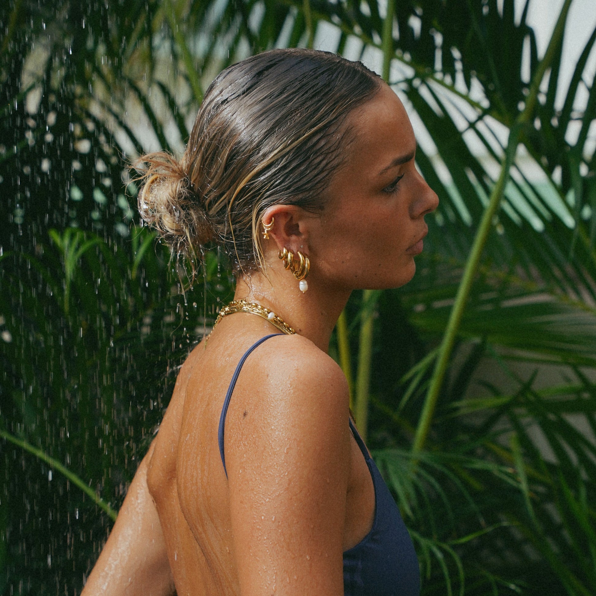 Shower, swim, sweat — our jewelry stays golden through it all.