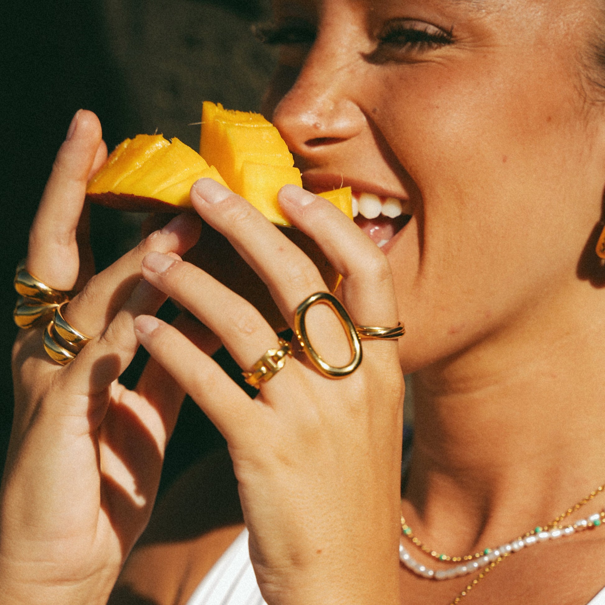 Shower, swim, sweat — our jewelry stays golden through it all.