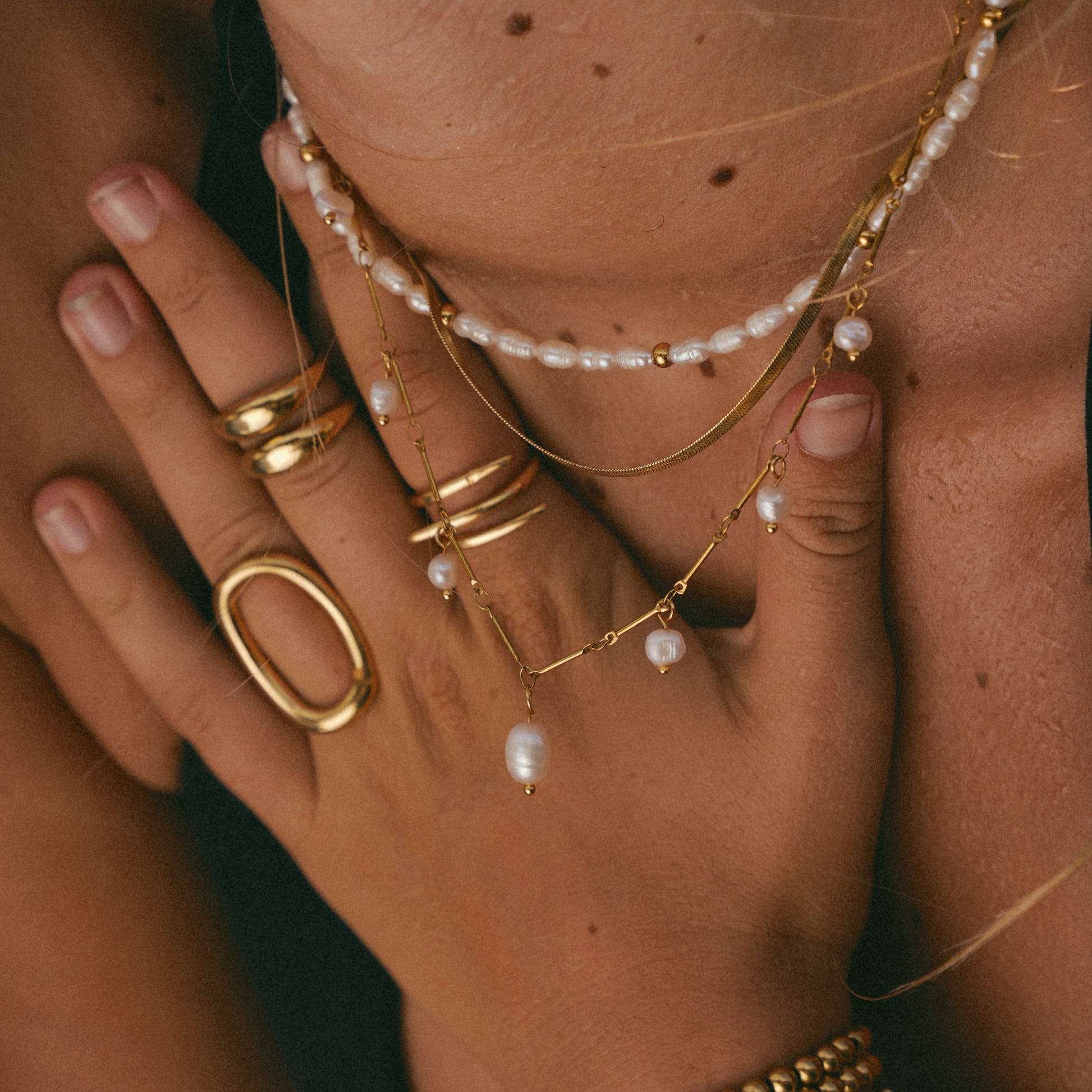 We use surgical-grade stainless steel paired with durable 18k PVD gold plating — a combination that resists fading, tarnishing, and everyday wear. Certain pieces are finished with genuine freshwater pearls or carefully chosen gemstones for a refined touch.